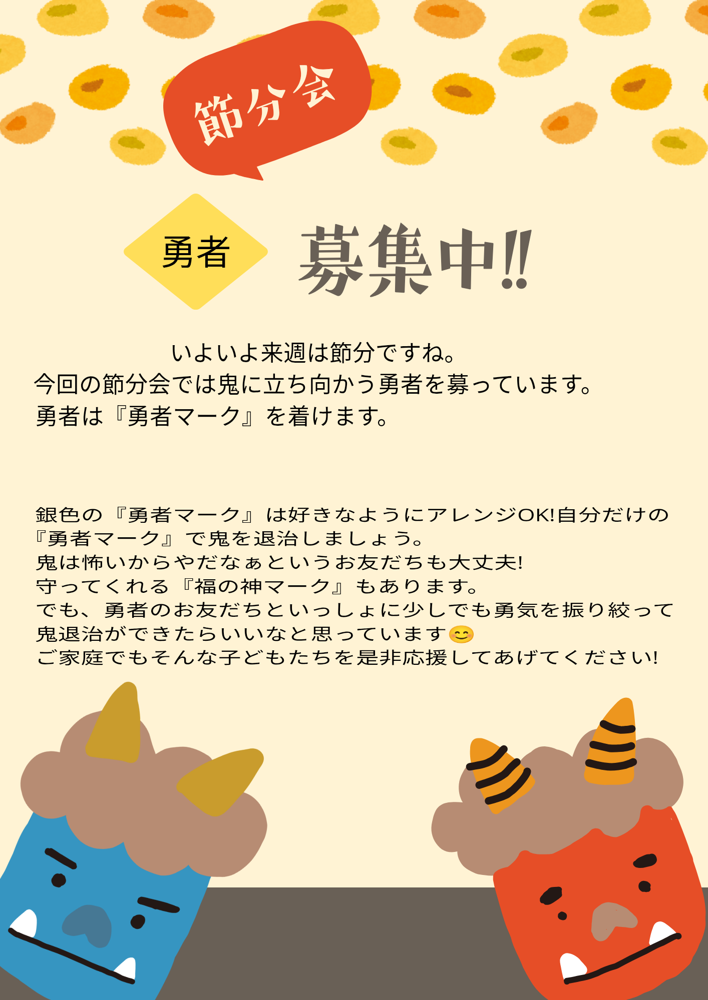 だからといって、「パワハラになるから節分はやりません」という話ではないと思っています。大切なのは、節分の本来の意味(邪気をはらって福を呼ぶ)をポジティブに子どもたちに伝えていくか…です。