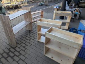 今回は保育室の教材棚や赤ちゃんクラスの外用靴入れなどが完成しました。