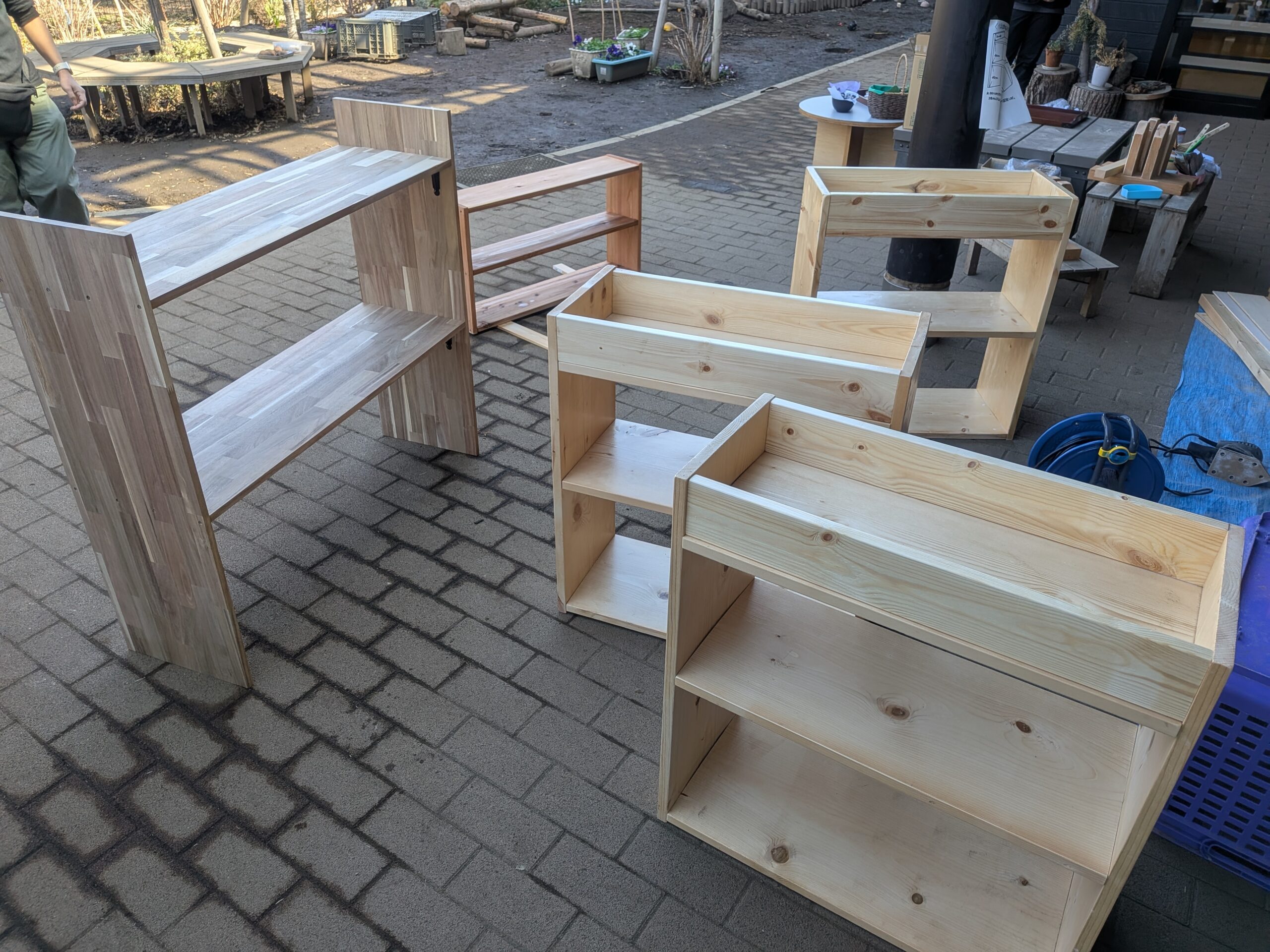 今回は保育室の教材棚や赤ちゃんクラスの外用靴入れなどが完成しました。