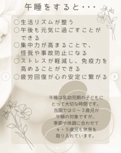 5歳児は毎日数名ずつのチームに分かれて各クラスに来てくれていて、寝かしつけが終わり次第、子どもたちだけで5歳児クラスに戻ります。全職員がしっかり連携を取って見守り、子どもたちを信頼しているからこそできる取り組みだと思っています!