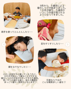 9月から始まった5歳児による寝かしつけ。4月に入園した0.1歳児のお友だちも、普段の異年齢交流の中で信頼関係が芽生えたことで、5歳児のもとで安心して眠ることができています。