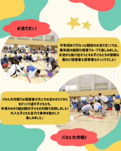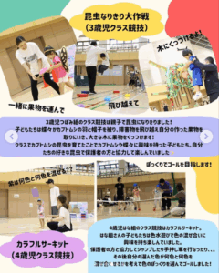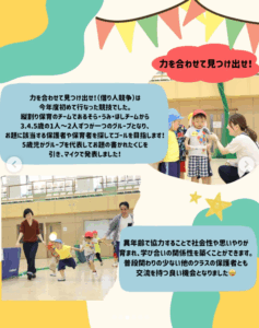 運動会といえば何か月も前から毎日練習を重ねていくということイメージがあるかと思いますが、そうではなく遊びの延長線上に行事があるということを何よりも大切にしています。子どもたちが普段の遊びや園生活で楽しんでいることを保護者の方と一緒に楽しんだり、知ってもらいたいという想いを込めて行事を開催しています😌