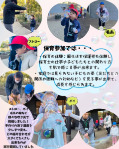 今回の保育参加では、日頃から「やってみたい」と思うことに挑戦してみたり、「これが好き」という遊びをじっくりと楽しんだり、いつもは友だちと遊んでいることを大好きなおうちの人と一緒に楽しみました。