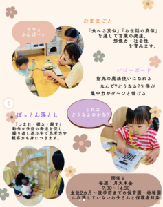同じくらいのお友だちや先生たちと一緒に「集中して遊べる手づくりおもちゃ」や「身体をいっぱい動かせる運動あそび」など、ご家庭での関わりのヒントになるあそびをたくさん用意しています。