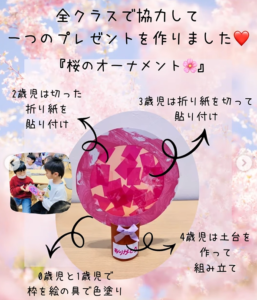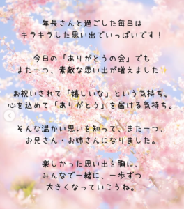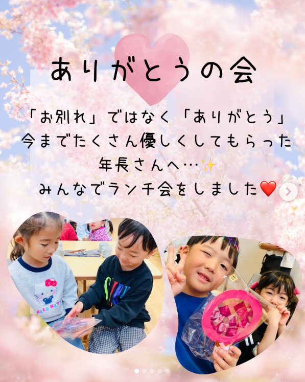 【ありがとうの会】「たくさんの優しさをありがとう」笑顔で囲んだランチタイム 2026.03.27 2026年3月10日⭐️ 年長さんへの感謝の気持ちを込めて「ありがとうの会」を開きました。 年中さんのエスコートで入場し、みんなで心を込めて作った桜のオーナメントをプレゼントしました🌸年長さんへのインタビューをして、お楽しみ給食を囲んでみんなでランチタイム! お祝いする側も、される側も、感謝の気持ちでいっぱいになった特別な日に。 大好きな年長さん、たくさんの優しさをありがとう✨